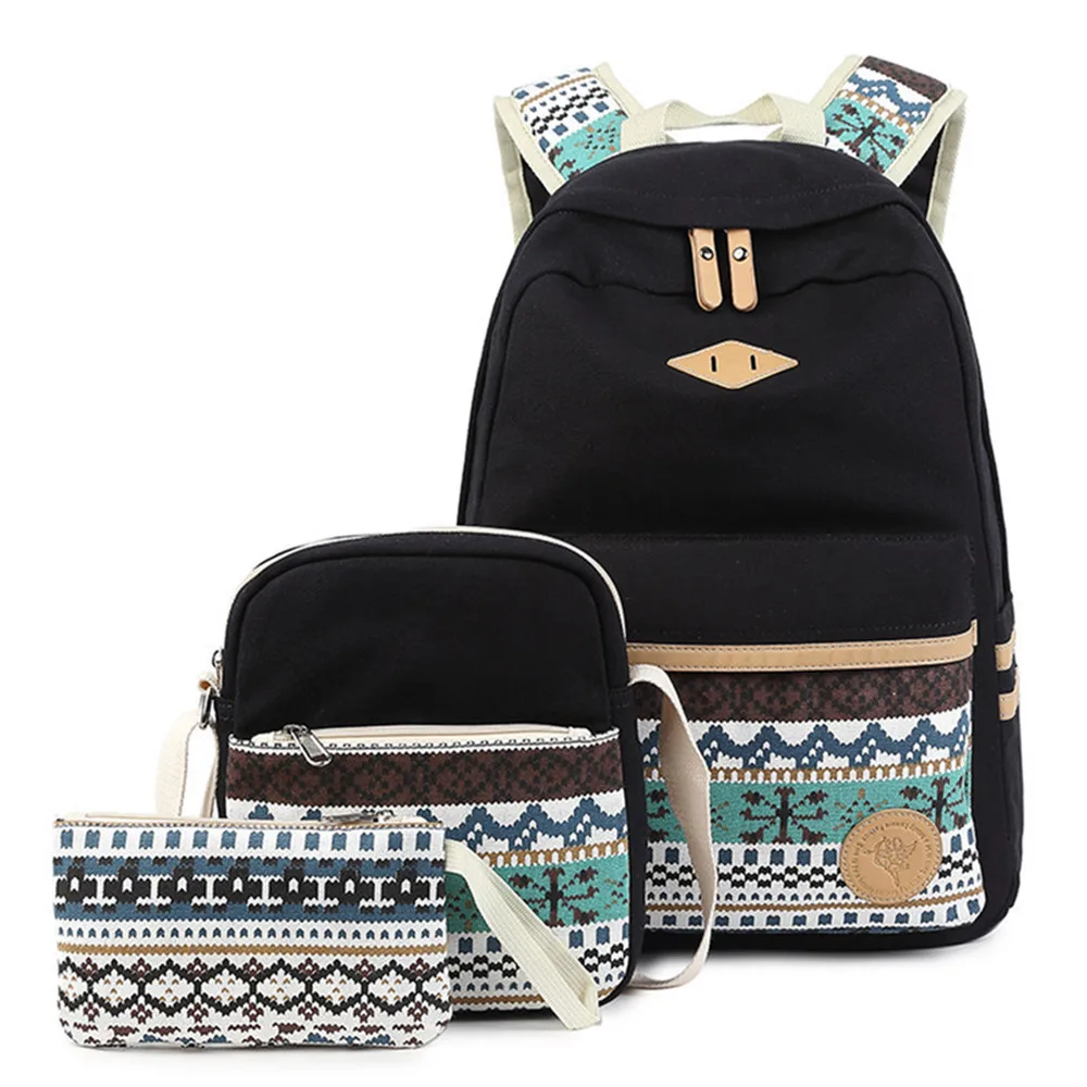 Name: Backpack Women School-Bags Printing Travel Teenage-Girls Stylish Canvas for Cute Black-Set